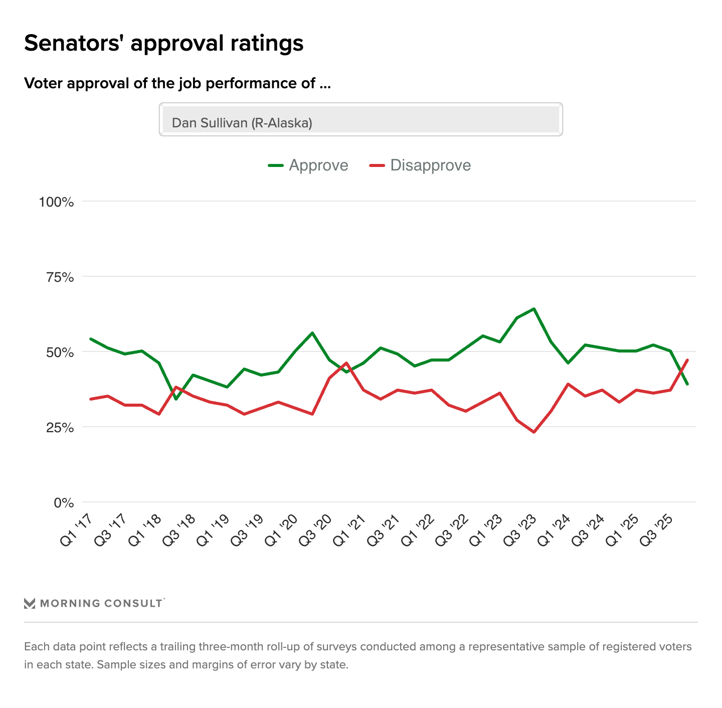 Recent polls have shown a drop in approval for Republicans in Alaska. The approval rating of Peltola’s senate opponent, incumbent Senator Dan Sullivan, has plummeted eleven points to 39% (47% disapprove) and turned net-negative for the first time since 2020.