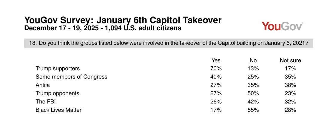 The poll asked respondents who they believed was involved in the insurrection. An insurrection that produced hundreds of videos and photos documenting the attack. While most (70%) correctly named Trump supporters as the attackers, a third of Americans (27%) said that they believe that ANTIFA & Trump’s opponents were behind the attack, a prominent conspiracy that, of course, is backed up by no evidence at all.