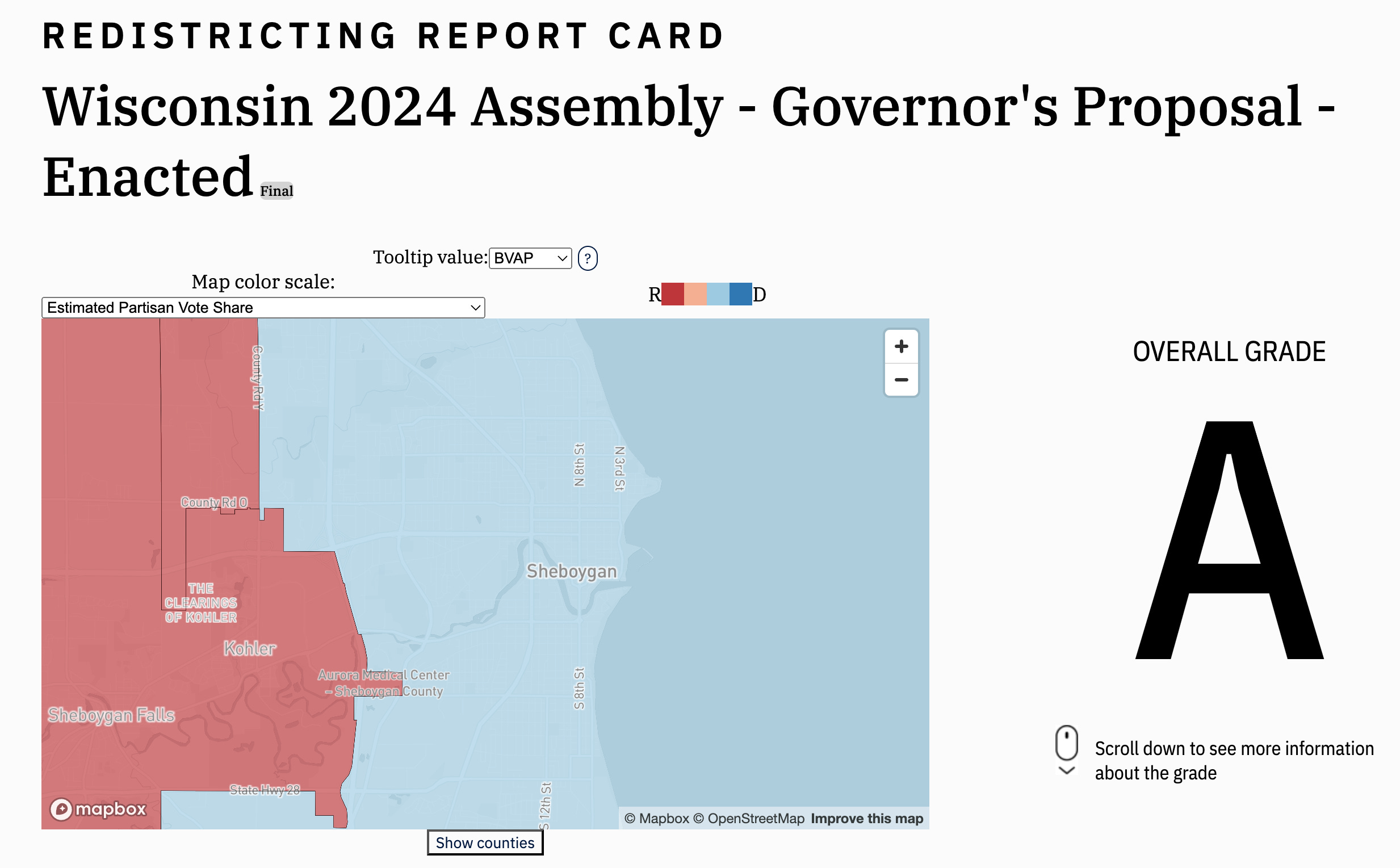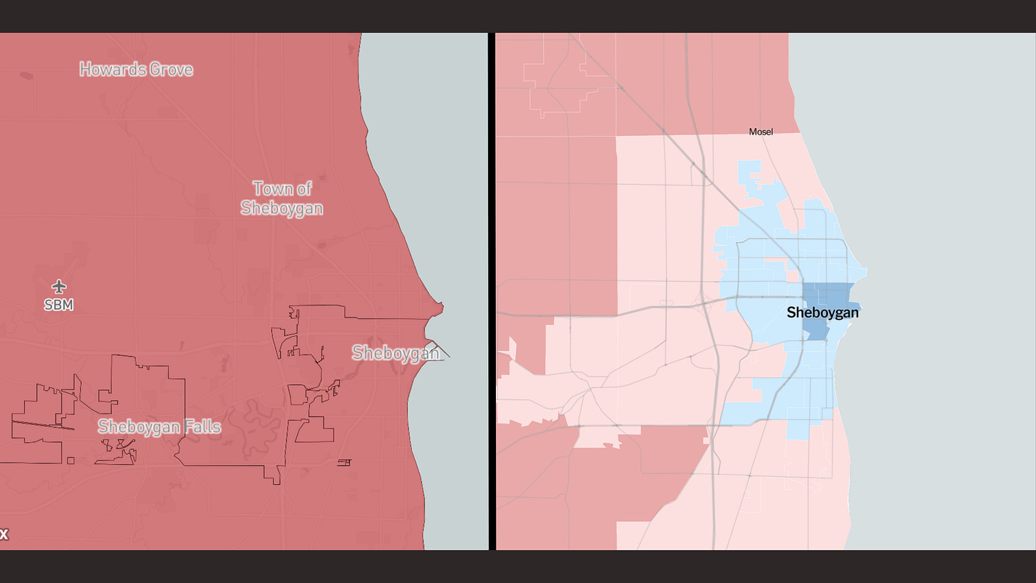In dem Bild kann man gut erkennen, wie die Stadt Sheboygan, die den Demokraten Biden mit mehr als 15% Vorsprung unterstützte, für die Landtagswahlen in zwei geteilt wurde. Diese zwei Distrikte laufen weit ins Land hinein und werden dadurch tief republikanisch.
